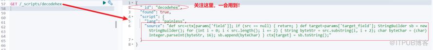PUT /_scripts/decodehex: 这部分指示Elasticsearch创建或更新一个名为decodehex的脚本。 script: 脚本的主体部分。 description: 脚本的描述,说明了脚本的作用,即解码HEX字符串。 lang: 脚本的编写语言,这里使用的是Elasticsearch的Painless脚本语言。 source: 脚本的具体内容。这个脚本接受一个字段名作为输入(params['field']),检查是否为空,如果不为空,则将其HEX编码的内容转换为普通文本并存储在指定的目标字段(params['target_field'])。