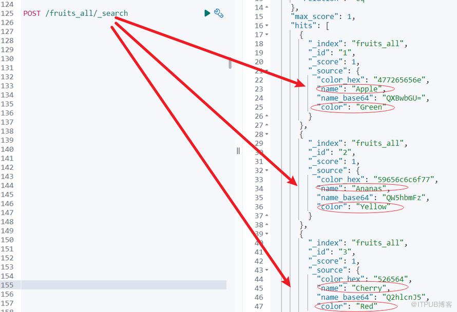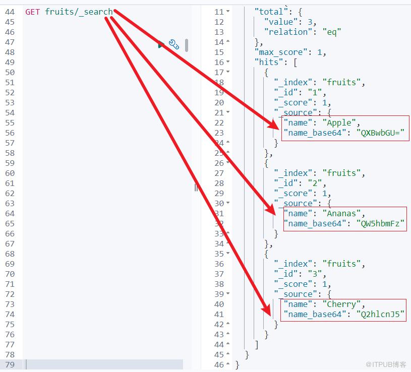 我们清晰的看到,咱们写入的 name_base64 字段借助我们创建的管道、基于存储脚本解码为 name字段值。