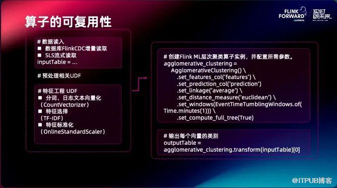 把这个案例中的算子进行抽取,像 SLS 流式读取,分词,日志的向量化,特征选择,特征的标准化,这些并不是业务独有的,而是很多在线学习业务都需要的算子,把它抽取出来,做成一个独立的组件,客户需要做在线学习流程的时候可以来复用这些算子。