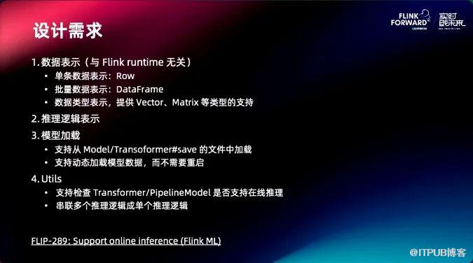 数据表示(与 Flink Runtime 无关) 单条数据表示:Row 批量数据表示:DataFrame 数据类型表示,提供 Vector、Matrix 等类型的支持 推理逻辑表示 模型加载 支持从 Model/Transoformer#save 的文件中加载 支持动态加载模型数据,而不需要重启 Utils 支持检查 Transformer/PipelineModel 是否支持在线推理 串联多个推理逻辑成单个推理逻辑