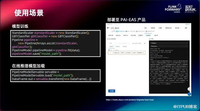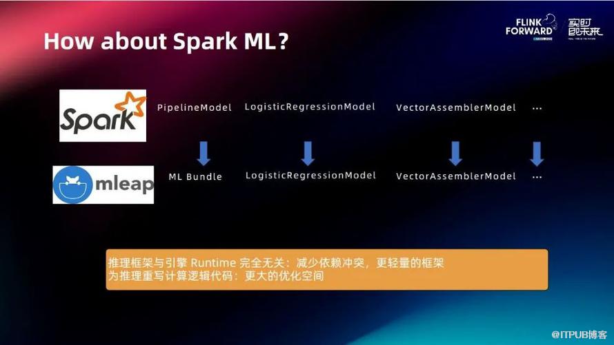 在做这个之前我们对 Spark ML 的推理进行了一个调研。后来发现 Spark ML 本身是没有推理模块的,它有一个 mleap,把 Spark 推理这部分做成一个推理框架,这个推理框架与引擎 Runtime 完全无关,减少依赖冲突,是一个更轻量的框架,另外这个新框架可以为推理重写计算逻辑代码,拥有更大的优化空间。