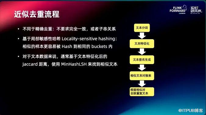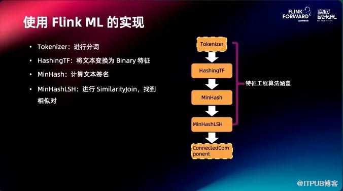 Tokenizer:进行分词 HashingTF:将文本变换为 Binary 特征 MinHash:计算文本签名 MinHashLSH:进行 SimilarityJoin,找到相似对