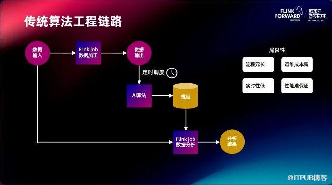 传统算法工程链路首先进行数据输入,用 Flink job 进行数据加工处理,数据会落盘,之后通过定时调度来拉起聚类算法,然后写出模型,这个模型再通过加载的方式拉起 Flink job 进行数据预测,但是整个链路具有局限性,流程比较复杂,运维成本比较高,实时性低,并且性能难以保证。