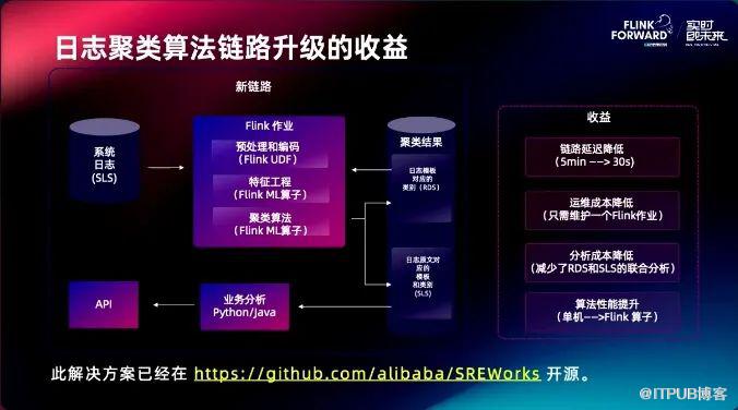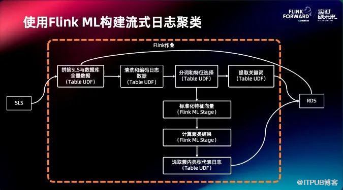 针对该流程我们使用 Flink ML 构建流式日志聚类就可以把这个流程串起来。通过 Flink job 拼接 SLS 与数据库全量数据,接着进行清洗和编码日志数据,然后分词和标准化,计算聚类结果,最后选取簇内典型代表日志。