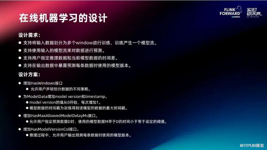 支持将输入数据划分为多个 window 进行训练,产生一个模型流。 支持使用输入的模型流来对数据进行预测。 支持用户指定推理数据和当前模型数据的时间差。每一条样本来了之后,我们希望用最新的模型去进行推理,但是最新的模型可能还没有训练出来,这个时候就需要设定一个时间差,允许它用非最新的模型进行推理。 支持在输出数据中暴露预测每条数据时使用的模型版本。从预测结果追溯出模型的需求。