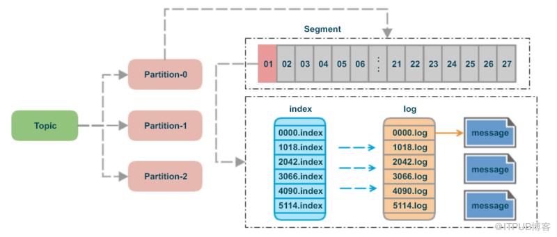 segment file 组成:由 2 大部分组成,分别为 index file 和 data file,此 2 个文件一一对应,成对出现,后缀”.index”和“.log”分别表示为 segment 索引文件、数据文件。 segment 文件命名规则:partion 全局的第一个 segment 从 0 开始,后续每个 segment 文件名为上一个 segment 文件最后一条消息的 offset 值。数值最大为 64 位 long 大小,19 位数字字符长度,没有数字用 0 填充。
