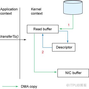 方法指示块设备通过 DMA 引擎将数据读取到读取缓冲区中。然后,将该缓冲区复制到另一个内核缓冲区以暂存到套接字。最后,套接字缓冲区通过 DMA 复制到 NIC 缓冲区。