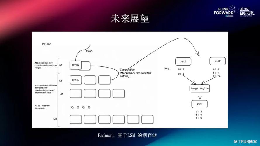 其次是部分计算下沉存储引擎,我们现在也在探索 Paimon 数据湖产品,它也是基于 LSM tree 的湖存储。从图可以看到,它所支持的是比较灵活的去定义两个 SST 文件合并,它的 key 合并的 Merge engine,以及现在已经支持的 Aggregation 的 Merge engine,在生产业务中比较简单的聚合场景就已经可以通过这种模式玩转起来。