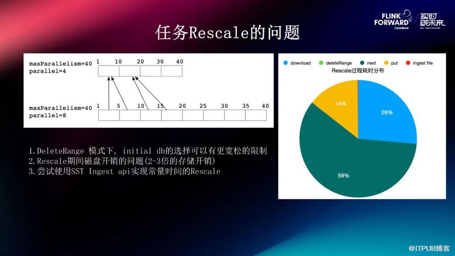 第二点是,我们发现在 Rescale 的过程中,它磁盘的开销可能会达到原始的两到三倍。因为我们跑的是一个云化环境,对于磁盘有比较高的限制,所以我们对于每一个 Worker 都有磁盘监控,当它磁盘超过某个值的时候,就可能会触发 Kill 的机制,让它释放掉,否则稳定性就无法得到保障。但是在 Rescale 的过程中,以上图为例,它在恢复的过程中,四扩到八个场景中,每一个原始的 Handle 比如1到10部分的状态会被1到5和5到10这两部分都下载。这样的话,状态在恢复的过程中它是 Double 的,并且可能由于 InitialDB 选择的并不合适导致我在 Open 时创建一个全新的 DB 将原始的数据全部导入进去,这样就可能会达到两到三倍的存储开销。