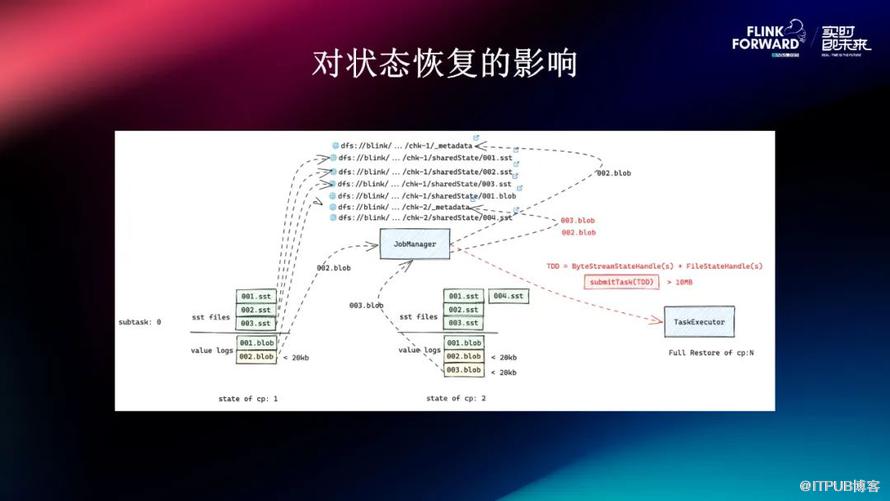 然后我们再来看为什么这种小文件会导致 Task deploy 的问题。首先,我们可以看到在 Checkpoint 的过程中,它是一个增量的过程,比如我们图中的 Subtask Manager 在做 Checkpoint 的过程中,它可能在 value logs 里有一个小于 20KB 的小文件,那么它在现有的机制里就会直接将这个数据传到 Job Manager 中,由 Job Manager 写入到 Metadata 文件里面,这也是一种优化机制,为了无需单独生成一个文件,将那些特别小的文件直接放到 Job Manager 的 MataData 。而在这个持续的过程中,它可能会产生比较多的小文件,并记录在 Matadata Data 里面。因为做 Checkpoint 是一个增量的过程,但是在恢复的过程中,是一个 FullRestore 的过程,就可能会存在提交 Task 到 Task Executor 上,部署的这个 Descriptor 包含了 ByteStream Statehandle 以及 File Stream Handle。这些 ByteStream Statehandle 在持续的增量、Checkpoint 的过程中,可能累加超过 RPC 限制的大小,最终导致任务在跑的过程中,因为挂一次而导致再也恢复不了。因为要传输的 State Handle 已经超过了 RPC 的限制。这个问题可能会和我们的这套 KV 分离的架构有一定的关系。因为在非 KV 分离的模式下,它的 SST 会持续的做 compaction。但是在 KV 分离模式下的 Value Log 的 Compaction 的频率会低于 SST 的 Compaction 的频率,因为本身的目的是为了减少 Value Log 的 Compaction 的频率。
