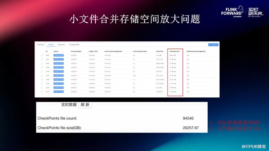 我们上线之后发现小文件的问题虽然解决了,但是它还是会有空间放大的问题。如上面的任务里面,它从任务侧汇报上来,这个任务只是占用了 38 G 左右的状态大小。但实际上,从 DFS 测试, Checkpoint 目录所占用的空间可能达到了它原始大小的七百多倍左右,并且它的文件数也比较多。所以,这种 case 并没有达到我们所预期的效果。