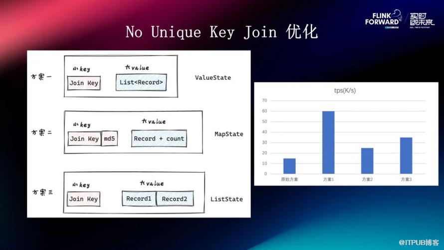 方案如图中显示的,它使用的是一个 Value State,然后 Join Key 就对应到一个 List Record,表示这个 Join Key 下所有出现的 Record。方案二是 Map State ,它也是以 Join Key 作为前缀,再加上 Record 的 MD5 值拼接成一个 Key,然后它的 Value 是 Record 以及它出现的次数。方案三是使用的一个 List State 的 Value ,就是在我写入的过程中,有一条 Record,Append 写进去的这样的效果。从我们线上测试的效果来看,就是这三种方案,都看到它的 Join Key 的 Value Pattern 都是小 Key 带 Value 的这种模式。