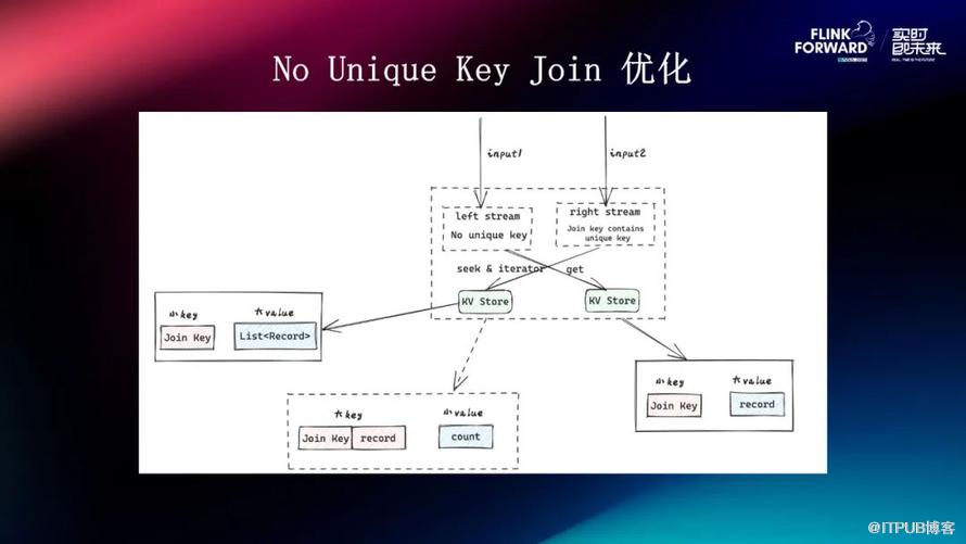 以上是从 AntKV 的角度来看存储引擎。从引擎的角度来看,以上是一个非常典型的 No Unique Key Join 的一个 case。我们知道在 Flink 里面,在它 Join 的场景中,它会根据你 Join Input 流是否包含 Unique Key 以及 Join Key 是否包含 Unique Key 去选择合适的状态存储的方式。
