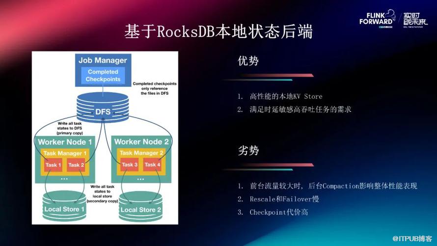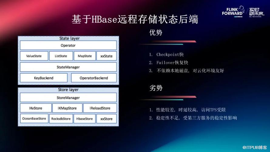 它的劣势也比较明显。首先,它的性能会比较差。因为对于这种分布式存储系统,它所能提供的访问延迟,基本都是在毫秒级,而本地存储一般能够到达微秒级,所以这个时延就比较高,它的整体的访问 TPS 就比较受限,一般不太适合于大状态的任务。第二,它的稳定性会不足,因为它会受限于第三方服务的稳定性影响,它整体的 SLA 就不如本地存储。