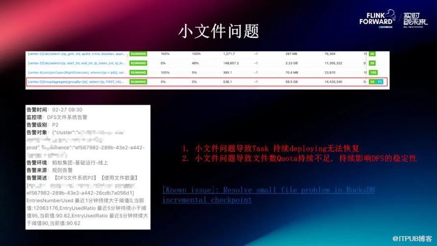 小文件的问题在社区也是一个比较有名的问题,它主要在我们内部可能会导致两个问题。第一个问题是会导致我们线上出现一些 Task 持续 deploying,它没有办法恢复。第二个问题是小文件导致我们的文件数扩大持续不足,持续影响 DFS 的稳定性。