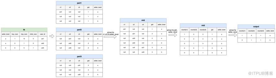 其执行过程中,首先会构建一个中间表 tb1,并扩展出三个虚拟维度:c1、c2 和 c3。