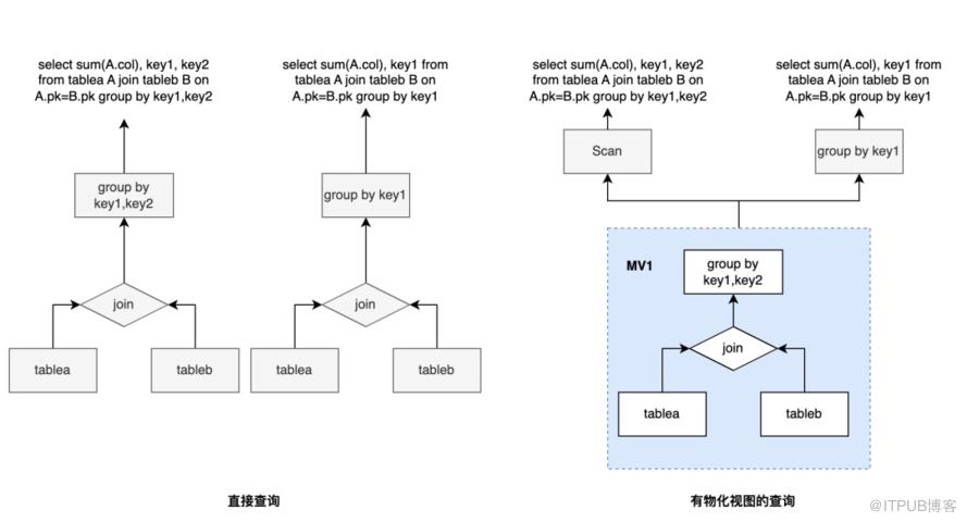 例如,如下图所示,未使用物化视图的查询(左侧)需要从基础底表中提取数据,而启用物化视图后(右侧),查询直接访问优化后的数据,物化视图的数据是底表数据关联聚合而来,可以显著减少数据量和提升查询速度。