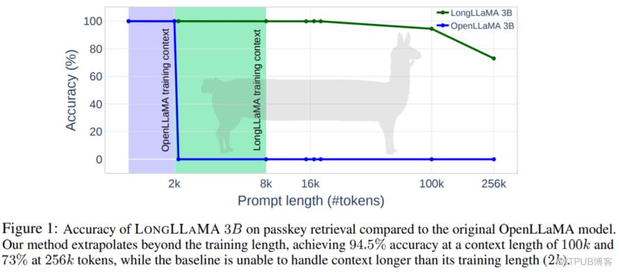 如下图所示,对标原始的 LLaMA 模型,伴随着 Prompt 长度的增加,LongLLaMA 表现出了极佳的性能,在上下文长度为 100k 时正确率才出现明显的下降,并且仍然可以达到 94.5% 的正确率。