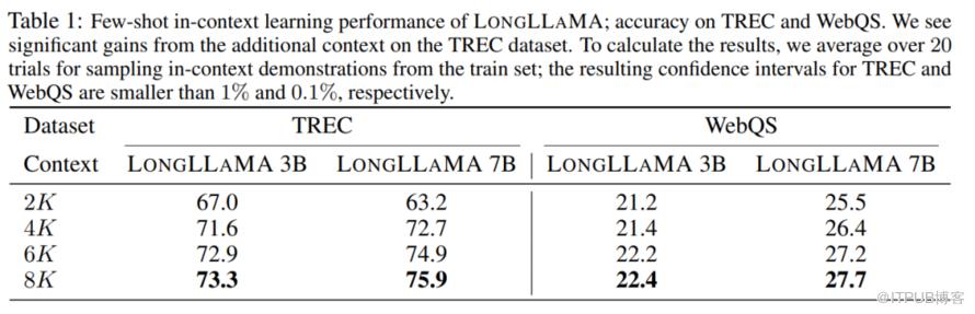 论文作者在两个下游任务 TREC 问题分类与 WebQS 问题回答中测试了 LongLLaMA 拥有的更长上下文长度对小样本学习中准确率的加成,如下图所示,在两个任务之中增加上下文长度都会有效提升准确率,并且在 TREC 问题分类中表现得格外优异,论文作者认为,TREC 数据集的分类有 50 个类别,而 2k 的上下文长度仅仅能支持 100 个示例,而很有可能一些类别在这 100 个示例之中不会出现,从而导致任务根本无法完成,而长下文长度的扩展则可以大大减轻这种风险。