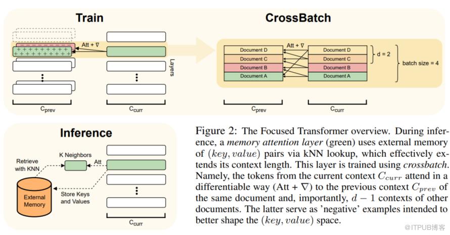 Focused Transformer 主要使用了 Memory Attention Layers 以及 CrossBatch 技术,在 Inference 的过程中,绿色的 Memory Attention Layers 使用 kNN 对外部的 Memory 进行查询,从而有效延长了上下文长度,而 Memory Attention Layers 则主要使用 CrossBatch 进行训练。