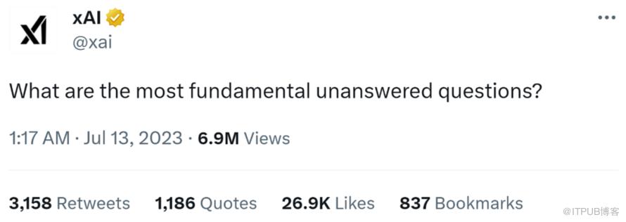 宇宙包罗万象,需要解决的问题何止千万。xAI 发表了第一条推文,「最根本的尚未解答的问题是什么?」