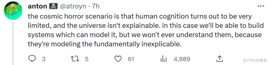 最后他表示,宇宙的恐怖之处在于人类认知非常有限,而宇宙是无法解释的。在这种情况下,我们能够构建对宇宙进行建模的系统,但永远不能理解它们,因为正在建模的东西在根本上无法解释。