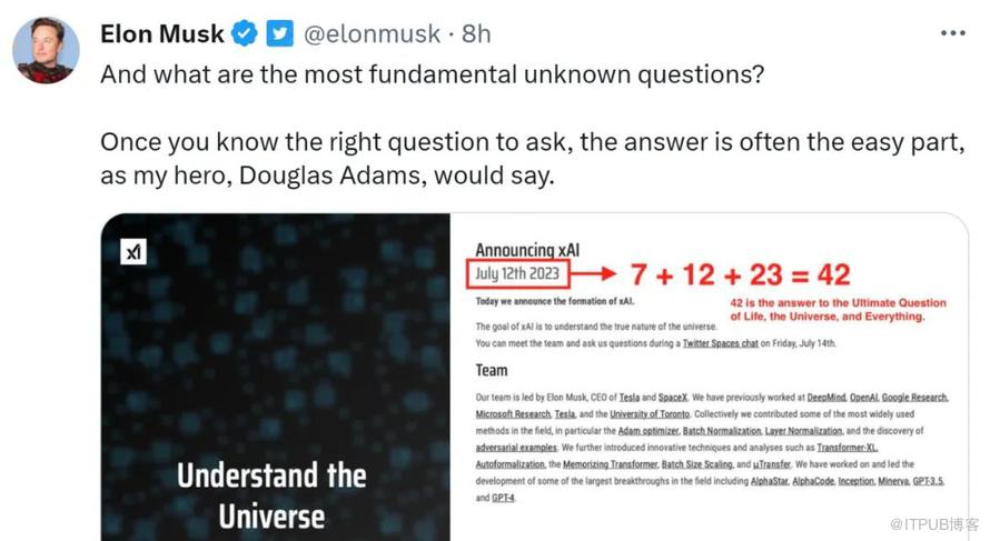 他还煞有介事地分解起了「2023 年 7 月 12 日」中的数字,表示 7+12+23=42,并认为 42 是生命和宇宙万物终极问题的答案。的确,官宣成立的日期也是在致敬。