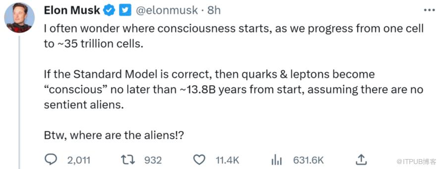 马斯克继续,「我经常想知道当人类从一个细胞发展到大约 35 万亿个细胞时,意识从哪里开始的。假如标准模型是正确的,那么夸克和轻子在开始后的 138 亿年后就会变得有意识,这里假设不存在有感知能力的外星人。顺便一问,外星人在哪?」