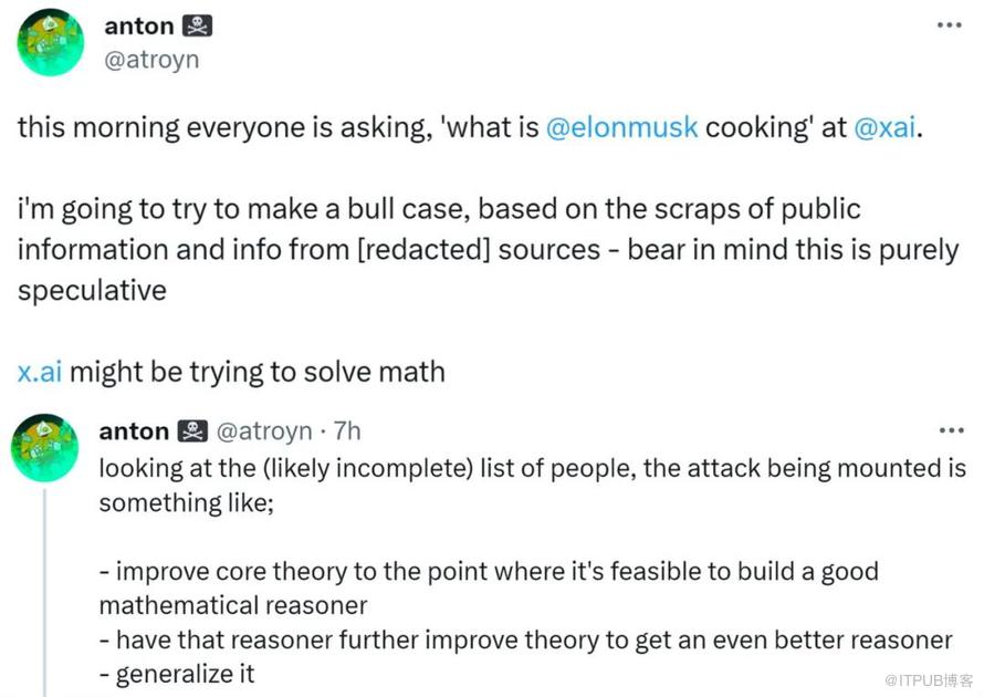 在他的观点中,xAI 可能会从第一性原理解决 AI for Math 问题(马斯克关于 42 的解读似乎也验证了这点),包括改进核心理论以能构建非常好的数学推理机、进一步改进推理机理论以构建更好的推理机、实现泛化。
