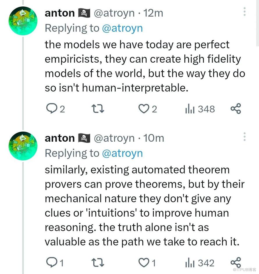 人们今天拥有的模型是完美的「经验主义者」,它们虽然可以创建世界的高保真度模型,但它们的方式是人类无法解释的。同样,现有的自动定理求解器可以证明定理,但由于机械性质,它们无法提供任何线索或「直觉」来改进人类推理。