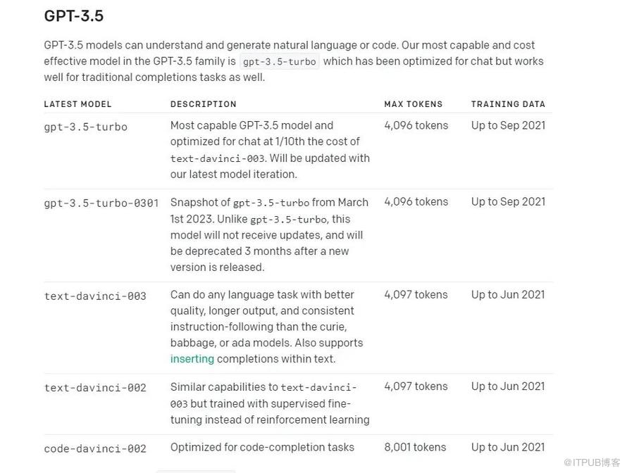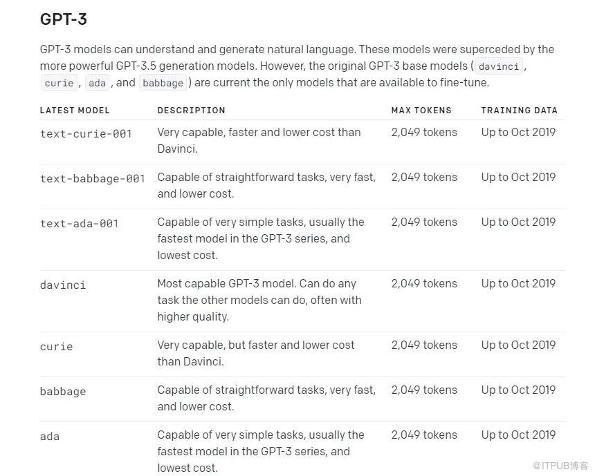 基于 GPT-3 的模型具有较低的 “Max tokens” 数值(2049),而基于 GPT-3.5 的模型具有较高的数值(4096)。因此,使用 GPT-3。5 模型可以处理更多的数据量。