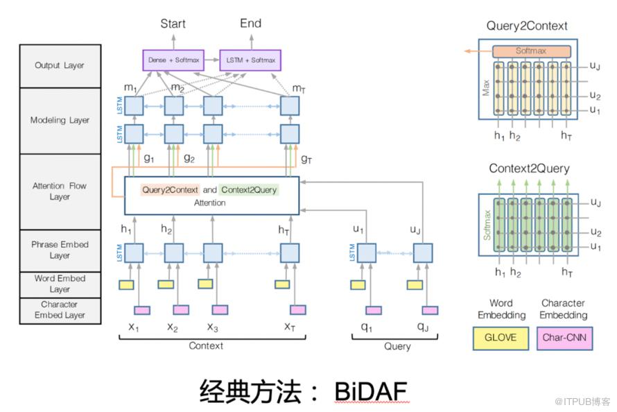 MRC的任务的定义是:输入Question+Document,直接用一个模型替代复杂流程,输出Answer。早期的MRC工作会设计一些比较复杂的网络结构,来对问题和答案之间的关系进行建模。一个比较经典的方法是BiDAF,它的输入层是对整个 document 和 query 分别映射到 enbedding 表示上,各自通过 LSTM 等网络来学习问题和文档上下文的表示,之后通过 Attention 交互层,采用双向注意力对 query 和 document的关系进行建模,在此基础上再通过 LSTM 网络获取更丰富的上下文表示,最终输出层预测每个位置作为答案开始和终止的概率,概率最高的片段被抽取作为答案。