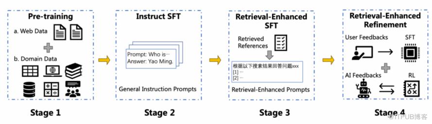 第四阶段,基于用户行为反馈做细致微调,以及通过强化学习等方式,提高生成答案的质量。
