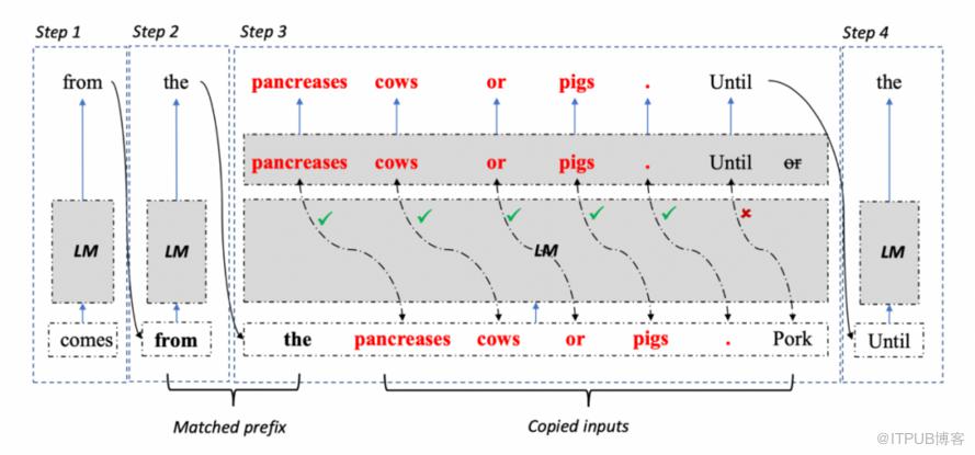 对于一些判别式模型,可以用蒸馏或一些其他的技术来做。但对于生成模型来说,模型尺寸小了对效果的影响较大,蒸馏并不特别适用,需要有一些其他的加速手段。近期业内有很多相关的工作研究,例如Inference with Reference,就是针对检索增强生成的业务场景,通过检测固定prefix,从参考中复制固定长度文本作为候选序列,验证如与模型输出一致则实现并行解码多步,如下图所示。