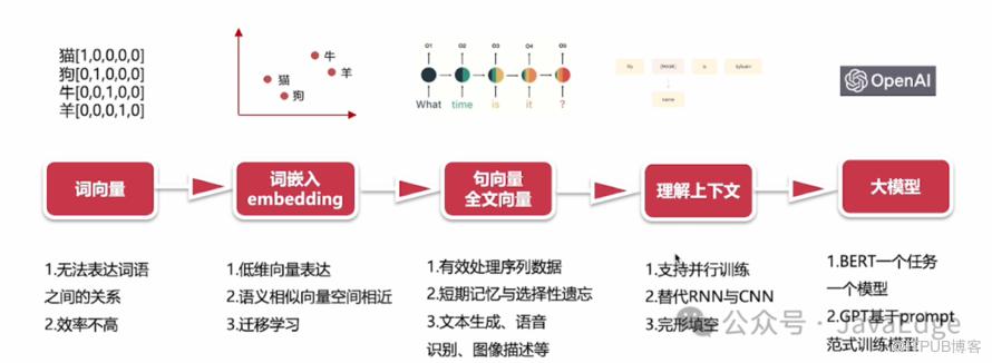 整个的大模型的发展,就是一个从点到面的发展过程。最核心也是最早的是基于这个词向量的技术。通过这个不断发展到神经网络,到这种单线的,到并行训练,最后直到超大规模训练集,实现一个大语言模型发展。