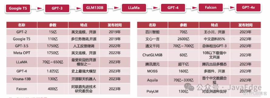 从这个发展上的角度来讲的话,那么大模型最早上节讲了它的一个发展,那我们可以从那个成品上面来看。那基本上在2017年左右吧,其实最早所有的大模型其实都是基于谷歌的,这个Transformer技术啊,也就是我们Transformer架构来设计的。那么,大概在2017年左右的时候,谷歌发布了它的T5模型啊,就以T5这个为代表吧,后续不断的具有新的这样大语言模型衍生出来。包括GPT-2、GPT-3、GLM-130B以Facebook为代表的这个开源的LaMa,还有后来的GPT-4以及说这个我们中东的科研机构开发的这个FanCL以及最新的我们的GPT的四的版本,包括多模态模型,还有它最新的大窗口模型啊,都是在最近在更新的。