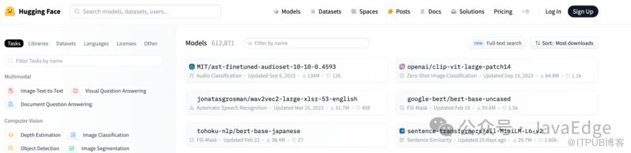 Hugging Face,爆脸,它相当于AI界的GitHub。那上面的话,我们很多这个开源模型啊,它会把开源之后的模型在这里做开源,我们在这里可以找到很多很多模型: