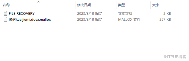 (1) 中毒表现,当计算机中了 mallox 勒索病毒后,企业计算机上的所有文件都将被加密,所有的文件后缀名统一变成 .mallox ,并且还会再桌面上留有一份“ FILE RECOVERY.txt ”的勒索文档。