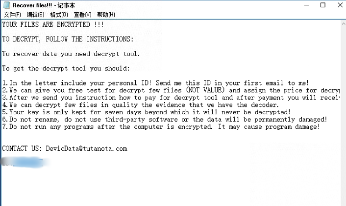 (2) 中毒特点,当发现计算机服务器被 devicdata 勒索病毒攻击后,企业计算机上的所有文件后缀名统一变成了 devicdata ,像 jiemihuifu.mdf 文件就会变成 jiemihuifu.mdf.devicdata.x-xxxxxx ,并且还会计算机桌面与所有扇区留下一封名为 Recover files !!! .txt 的勒索信。