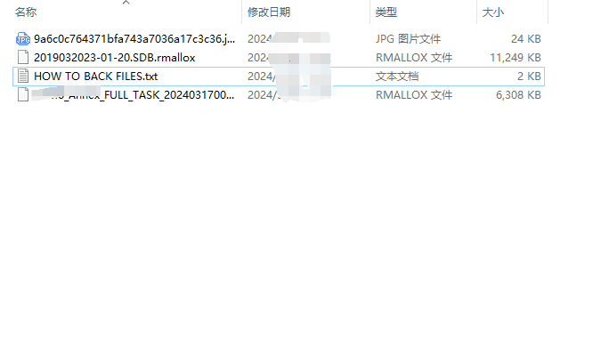 (2) 攻击表现, rmallox 勒索病毒攻击企业计算机服务器后,企业计算机服务器中的所有文件的后缀名统一会变成 rmallox ,像 jiemihuifu.mdf 文件,就会变成 jiemihuifu.mdf.rmallox ,并且在计算机桌面和所有文件夹内留下一封名为 HOW TO BACK FILES.txt 勒索信。