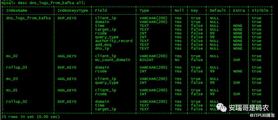 不管你实际创建的是rollup还是materialized view,查询出来的结果都一样,以上命令会把所有历史的、以及正在创建的结果都展现出来。