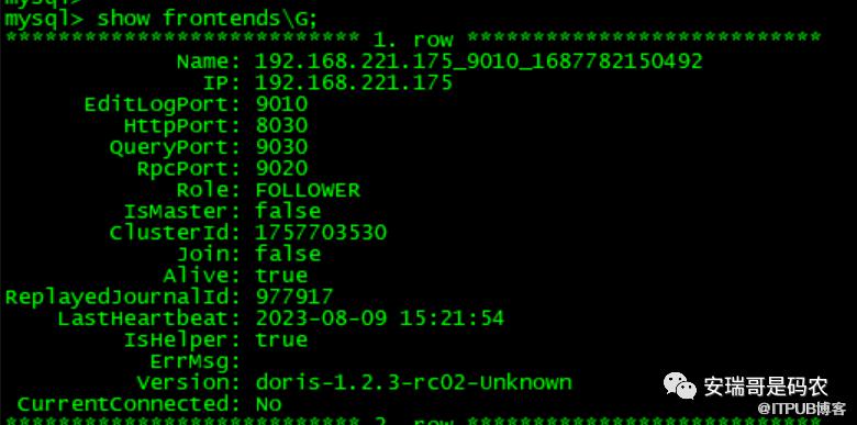 会显示当前集群有多少个FE,以及其角色状态,还有其他相关信息。