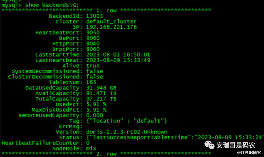 同样,运行这个命令后,再配置好并启动BE节点,才能将新的从节点加入到集群中。