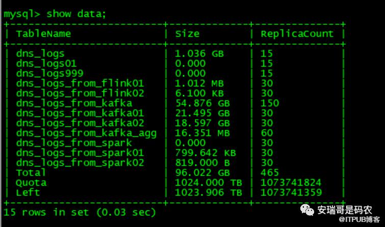 可以看到每张表的存储占用空间,以及每张表当前创建了多少分片,可以看到表dns_logs01,虽然是空表,但是在建表的时候因为指定了分桶数量为5,且其默认副本数量为3。