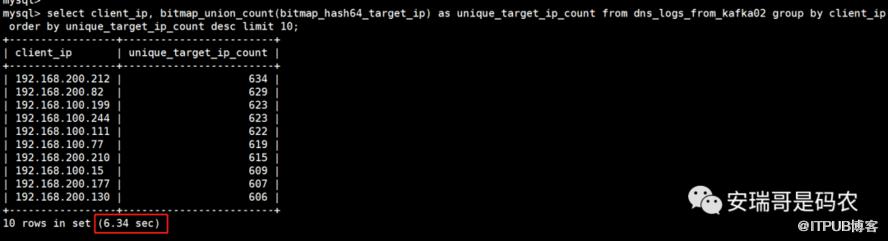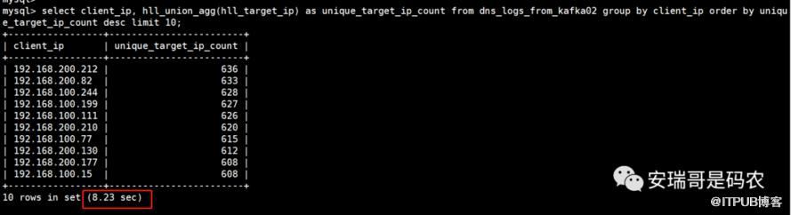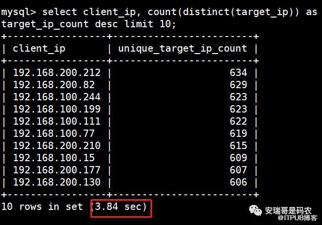 然后再看,如果我要知道每个client_ip访问了多少个不同的target_ip,这个查询效率如何,先看查询语句: