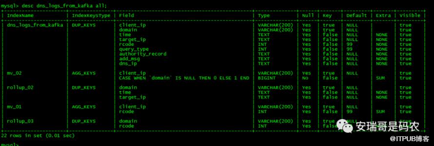 原本想着增加一个(domain,time,target_ip)这个字段组合的排序,但是实际上,因为这个varchar类型的20字节限制,导致它实际的排序字段只有(domain)一个,从对rollup的属性中是可以看到的:
