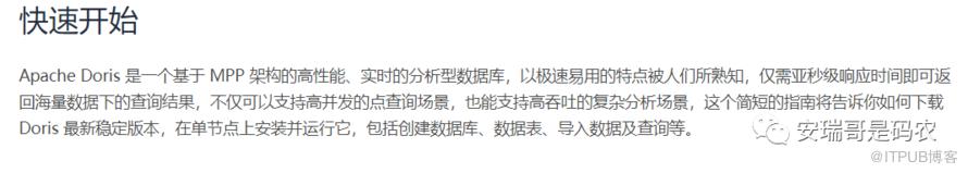 Doris是一款其实跟CK功能差不多的,近实时分布式OLAP数据库,这个从它的介绍,以及文档中的总体内容就可以大概看出来: