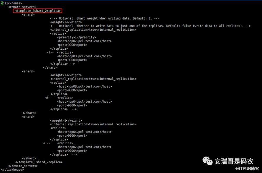 之前的文章说过,因为我搭建的集群只有3个节点,而且CK规定,每个节点只能存放一张分片表的一个副本,于是我的配置如下: