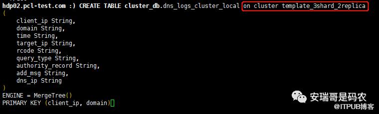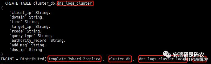 在上面创建分片表的建表语句中,指定了分片表需要依赖本地表dns_logs_cluster_local,那么就需要在每台机器上都创建这张本地表。