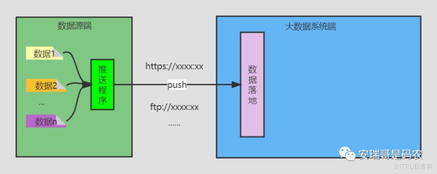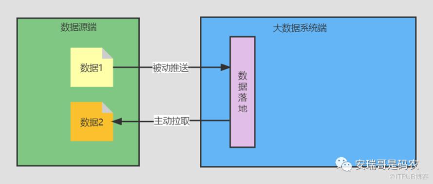 这种方式是由数据源端将数据推送给大数据系统,对于大数据系统端来说,就是被动接收的。